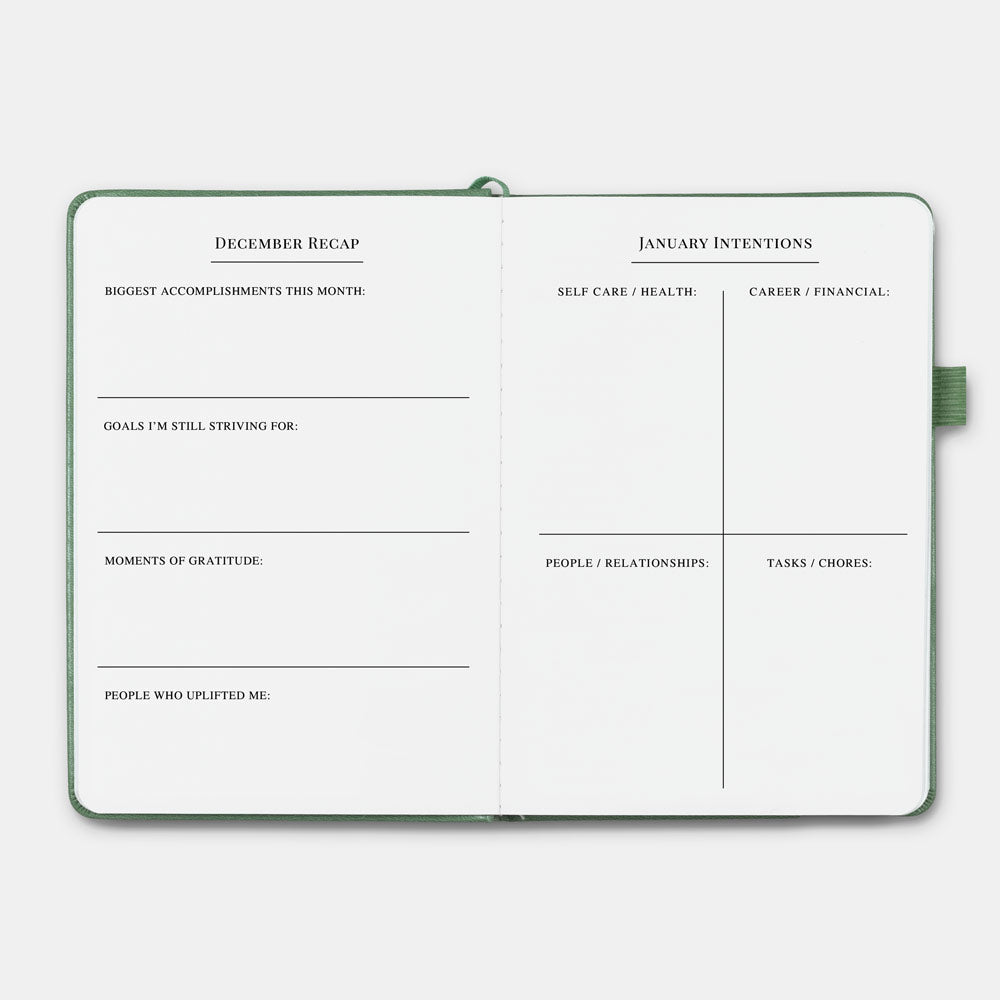 - Monthly reflection pages designed to evaluate progress and refine goals